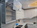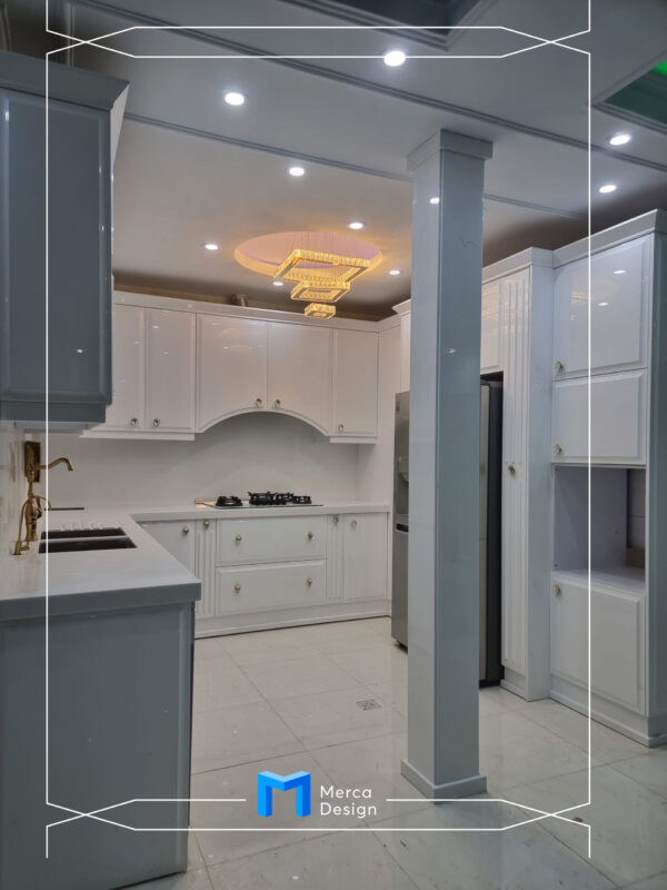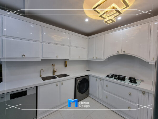 جنس درب ها و نماها ام دی اف25میل به همراه رنگ پلی اورتان سفید سوپر براق و جنس بدنه ها ام دی اف سفید و سنگ روی کار از جنس کورین می باشد. یراق آلات و تجهیزات مورد استفاده ازبرندبلوم شامل: سوپرهای بلند 20سانتی کنار یخچال و سوپرهای جا ادویه 20سانتی کنار کمدگاز میباشد. جک HF بلوم زیبایی خاصی را به درب ها داده است.