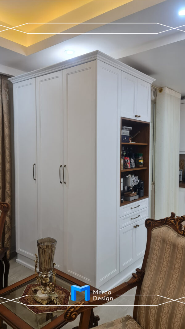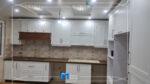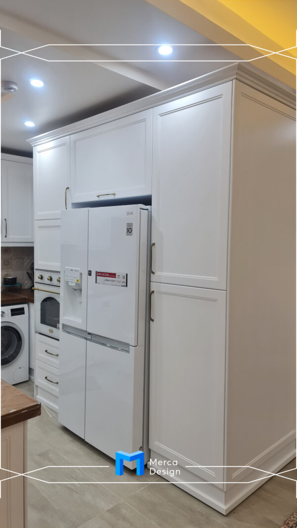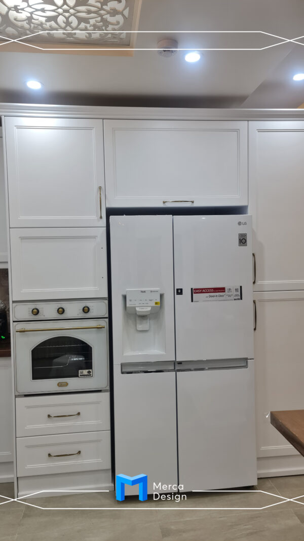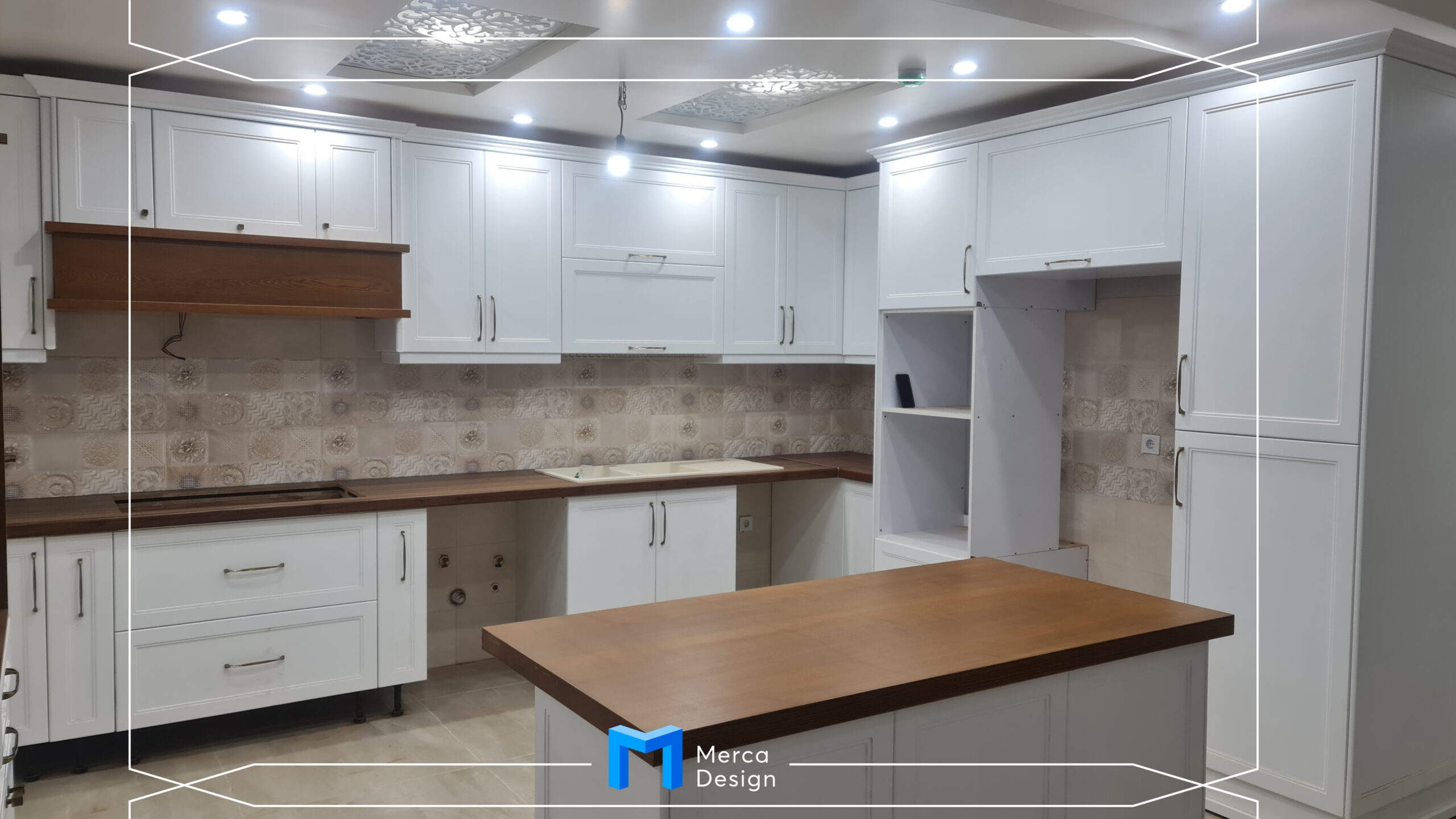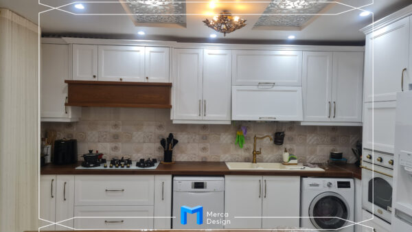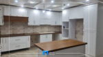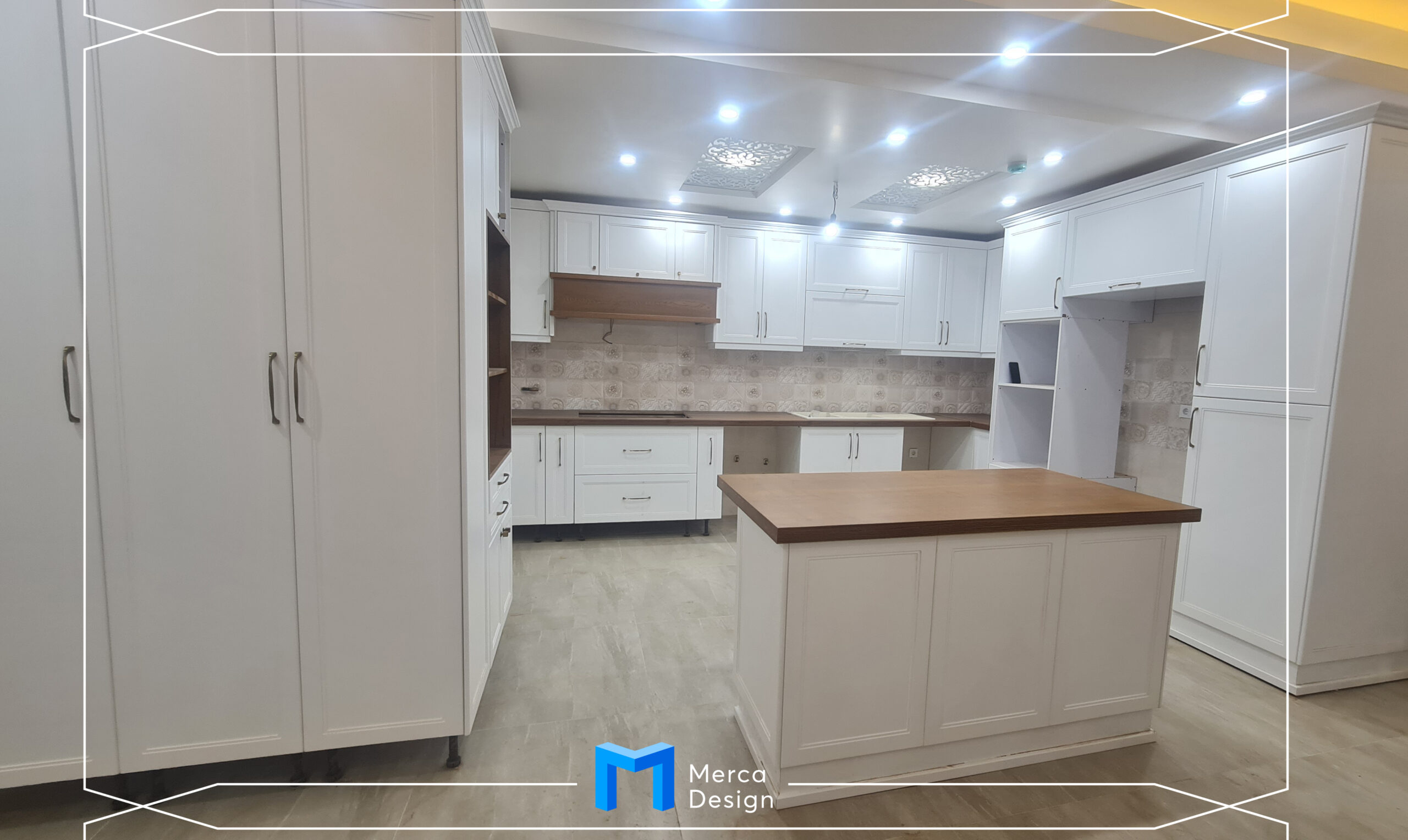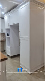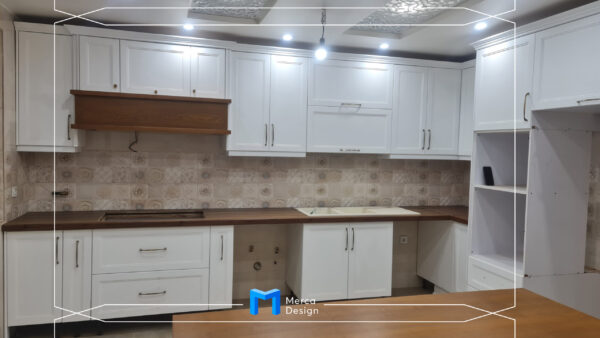 جنس بدنه ها ام دی اف سفید و جنس درب ها و نماها طرح نئوکلاسیک کف تراش و رنگ پلی اورتان سفیدسوپرمات و ترکیب 2رنگ سفید و روکش طبیعی بلو ط میباشد.